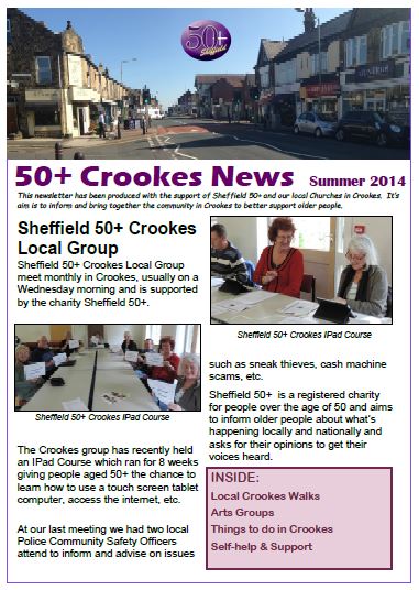 The Sheffield 50+ Crookes Summer 2014 Newsletter is now published and available to download below. Sheffield 50+ Crookes Local Group meet monthly in Crookes, usually on a Wednesday morning and is supported by the charity Sheffield 50+.