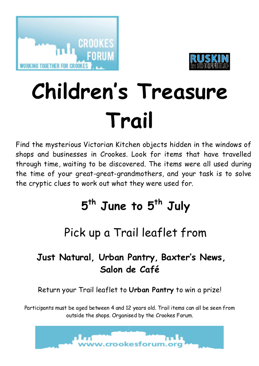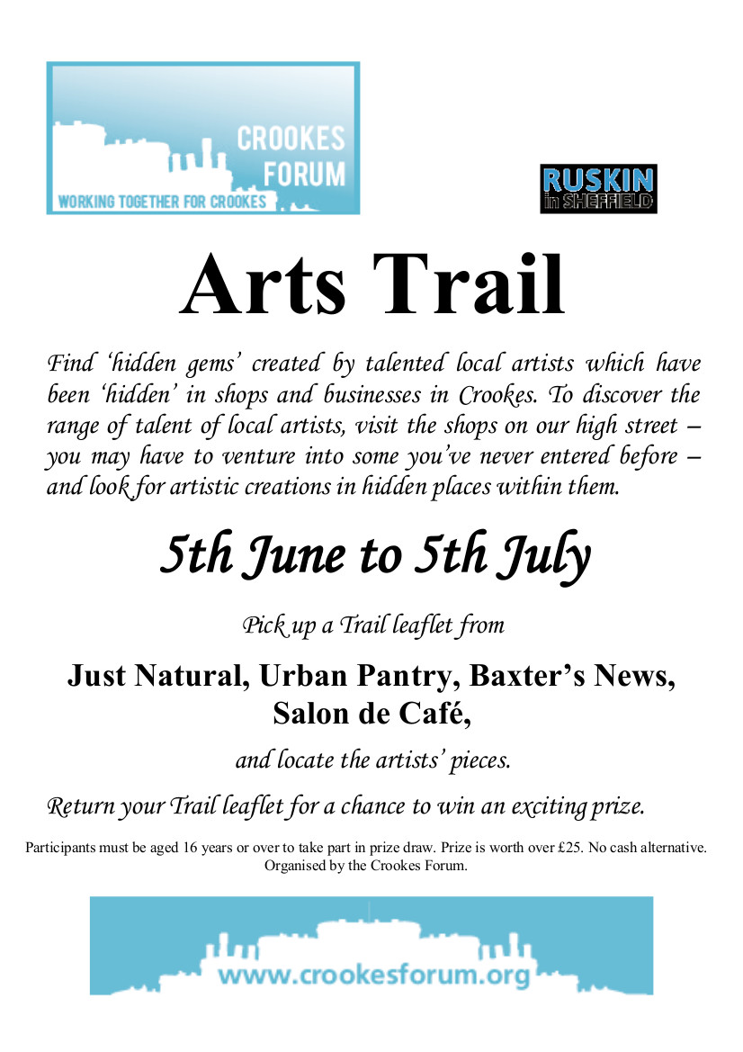 2 new activities in Crookes shops are taking place throughout the next month. An Arts Trail and a Children’s Treasure Trail in the shop windows. Click on the posters below for more details. Related Published by crookesforum View all posts by crookesforum