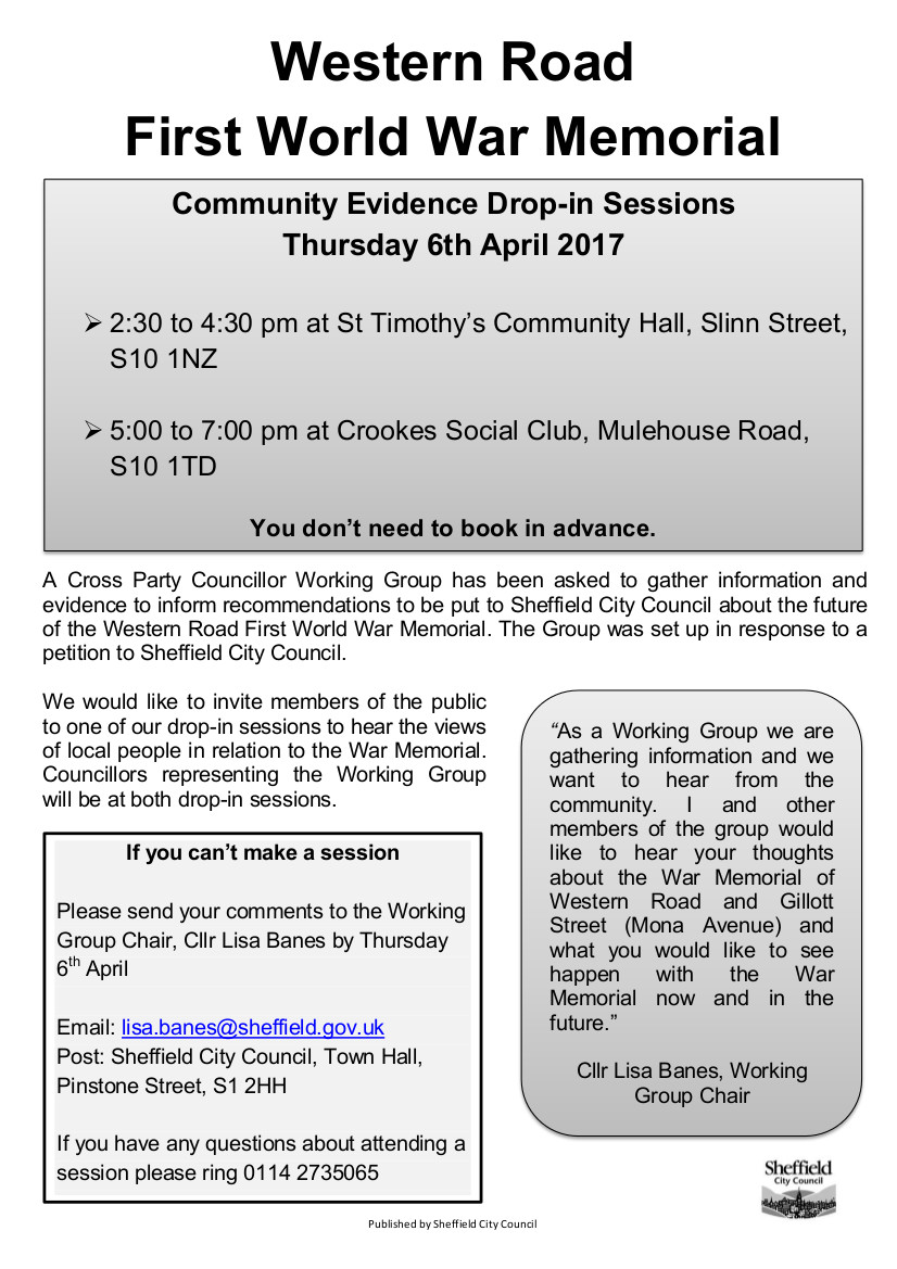 Poster from Sheffield City Council about the Community drop-in sessions in Crookes Thurs 6th April. Click on the image below to enlarge the text Related Published by crookesforum View all posts by crookesforum